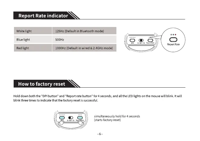 Hold down both the '"DPIbutton" and "Report ratebutton" for 4 seconds,and all the LEDlightson the mousewill blink. It will