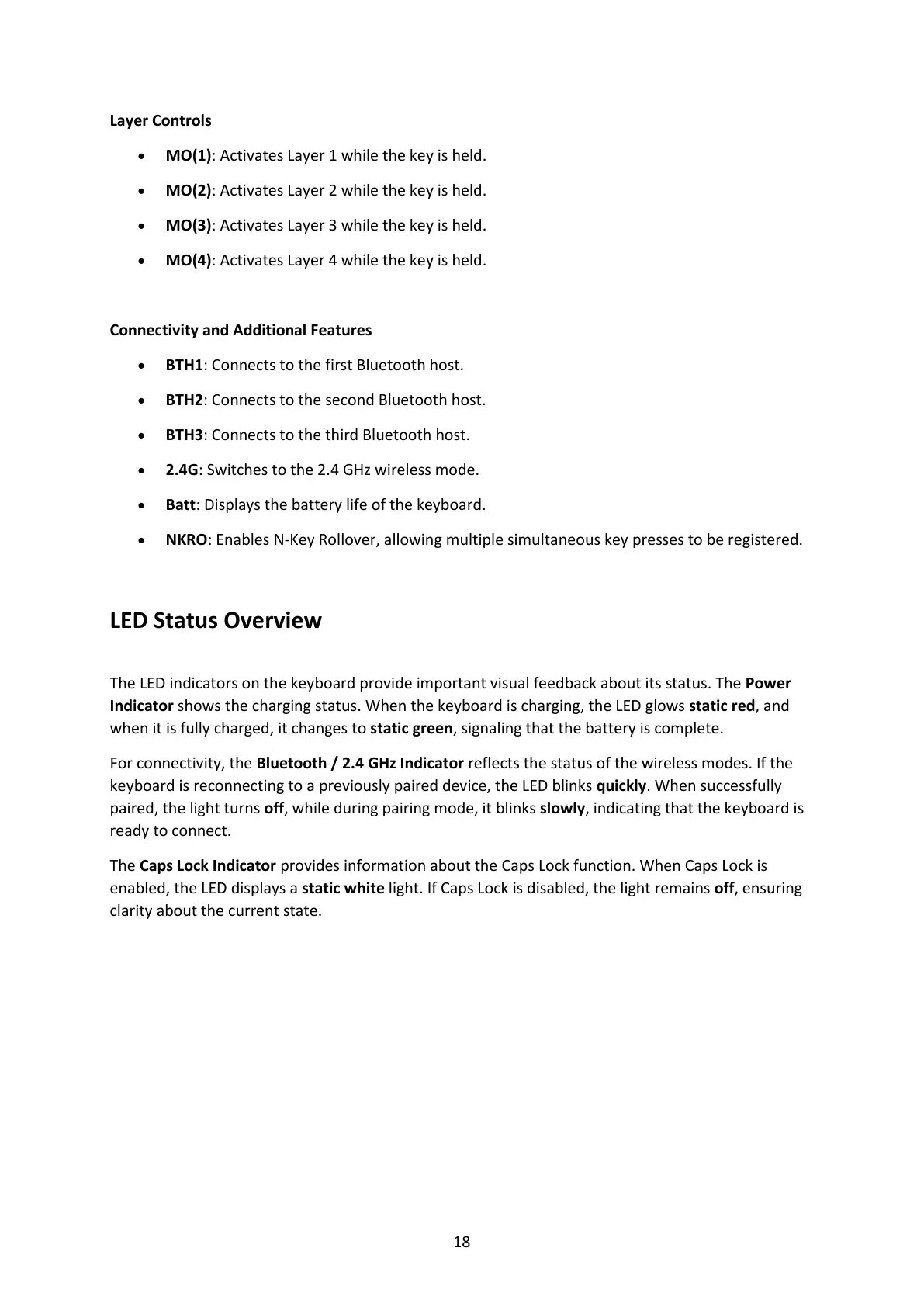 For connectivity, the Bluetooth / 2.4 GHz Indicator reflects the status of the wireless modes. If the