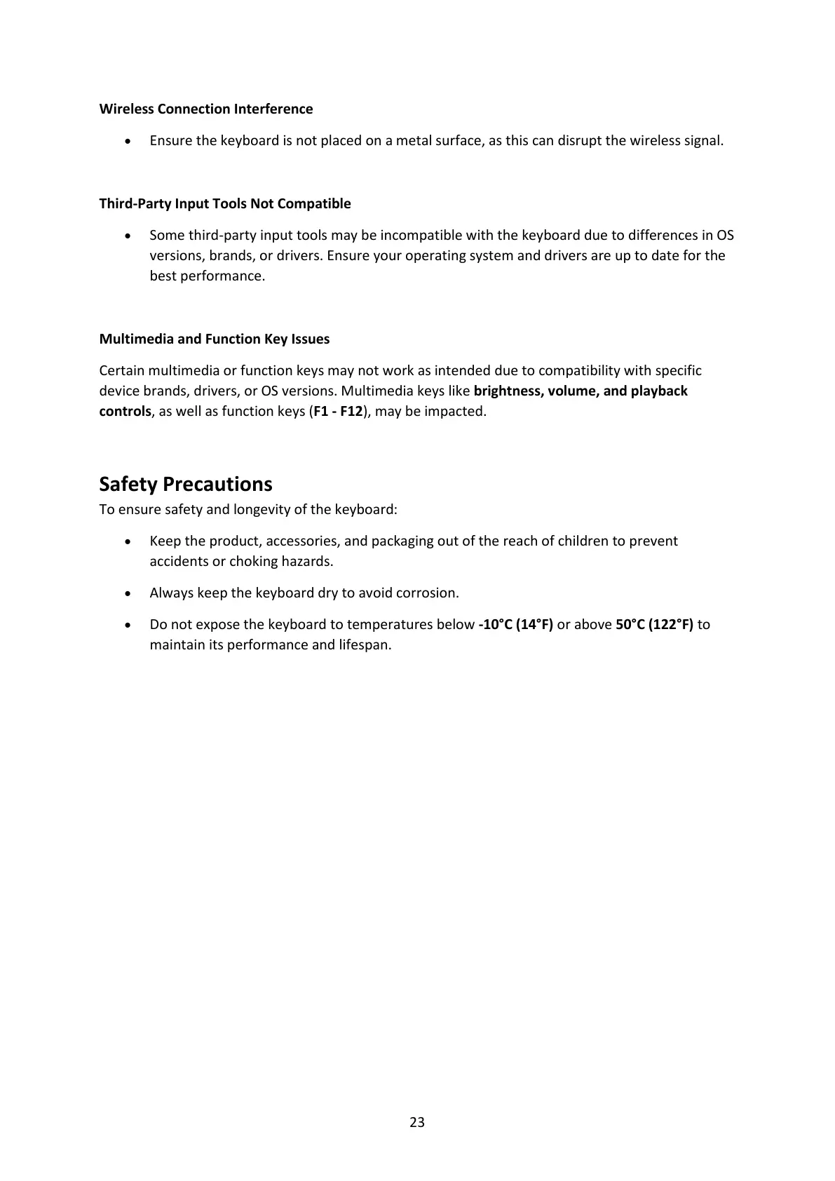 • Do not expose the keyboard to temperatures below -10°C (14°F) or above 50°C (122°F) to
