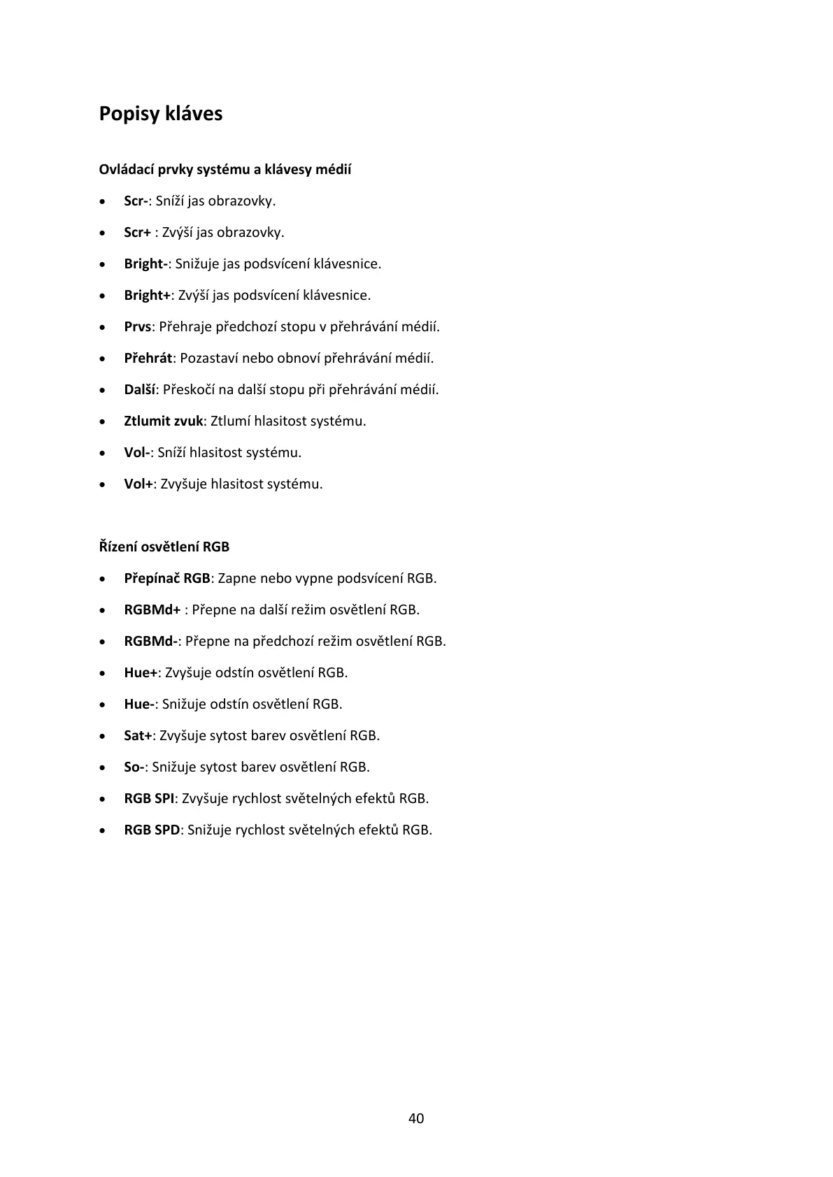 • RGBMd-: Přepne na předchozí režim osvětlení RGB.