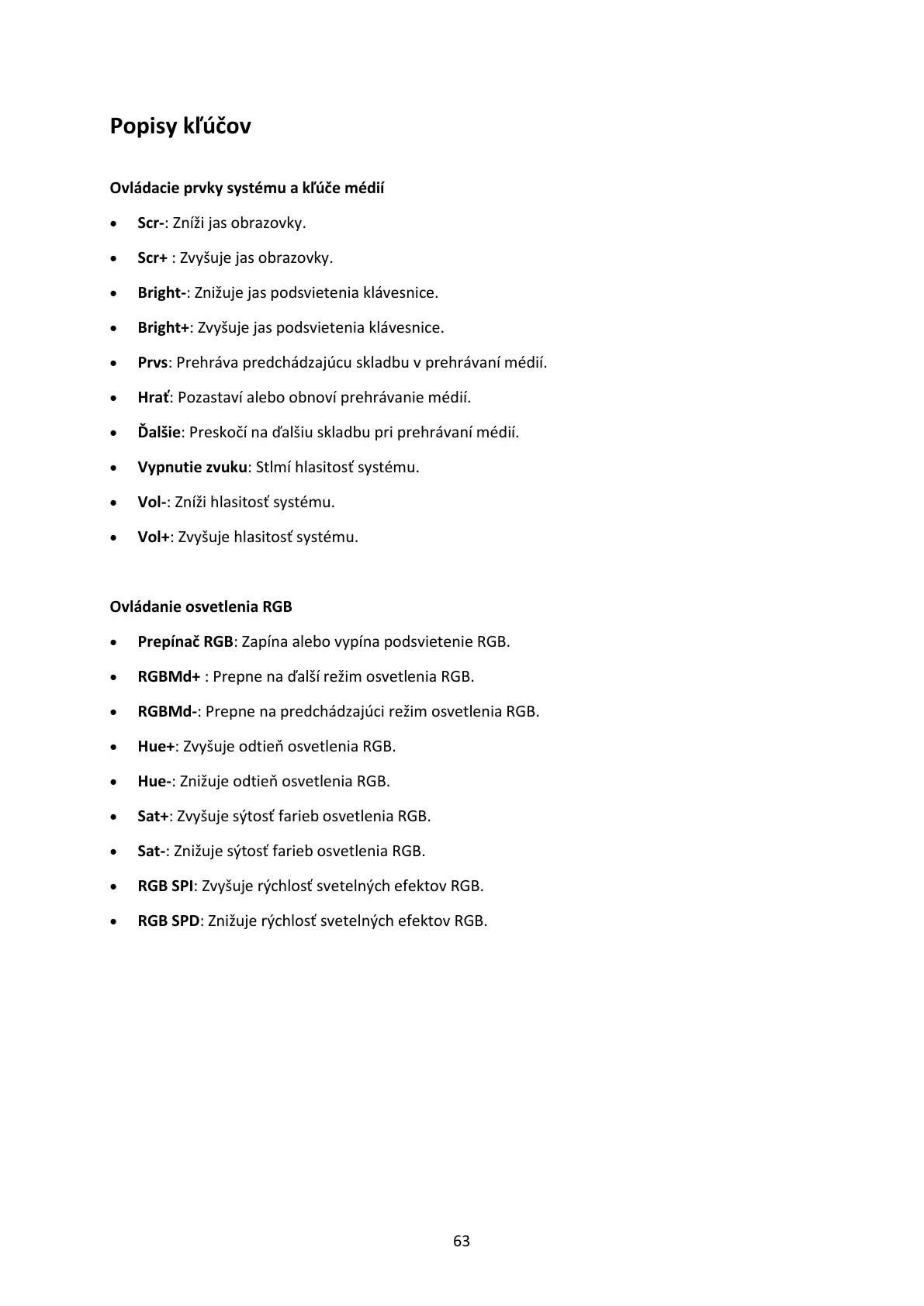 • Bright-: Znižuje jas podsvietenia klávesnice.
