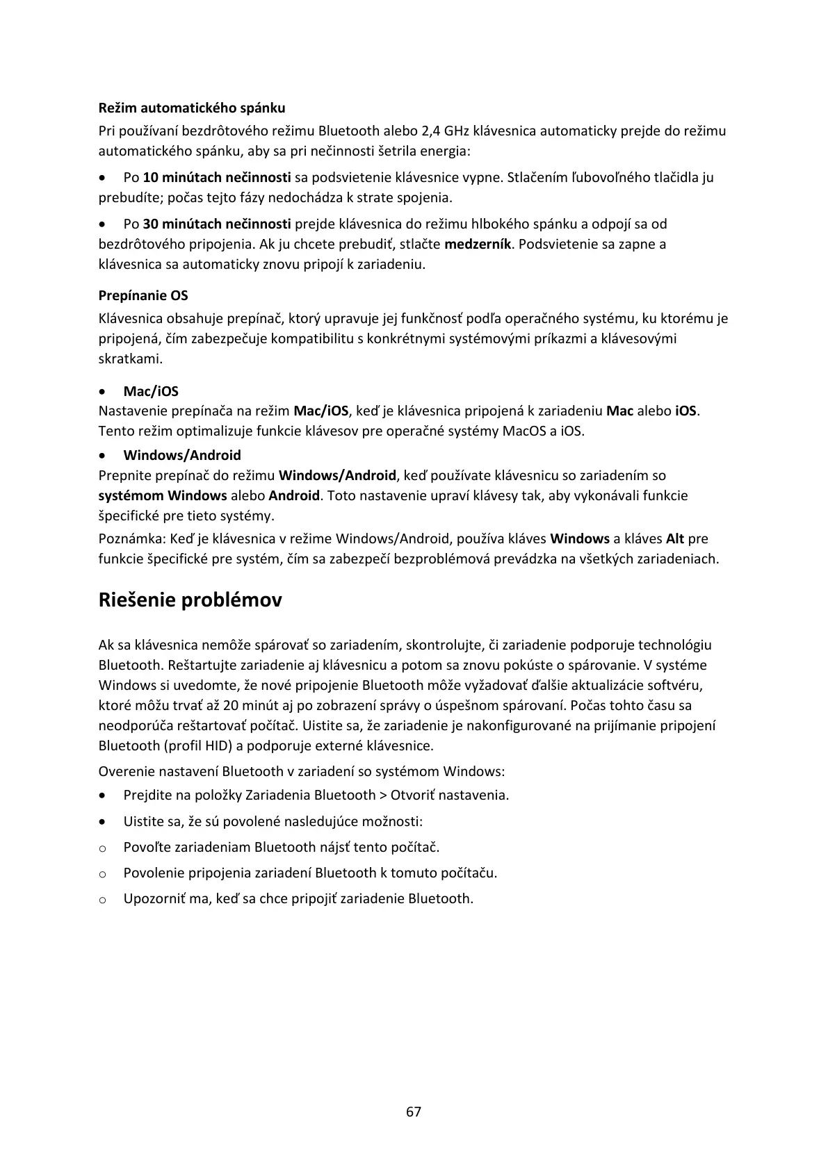 • Po 30 minútach nečinnosti prejde klávesnica do režimu hlbokého spánku a odpojí sa od