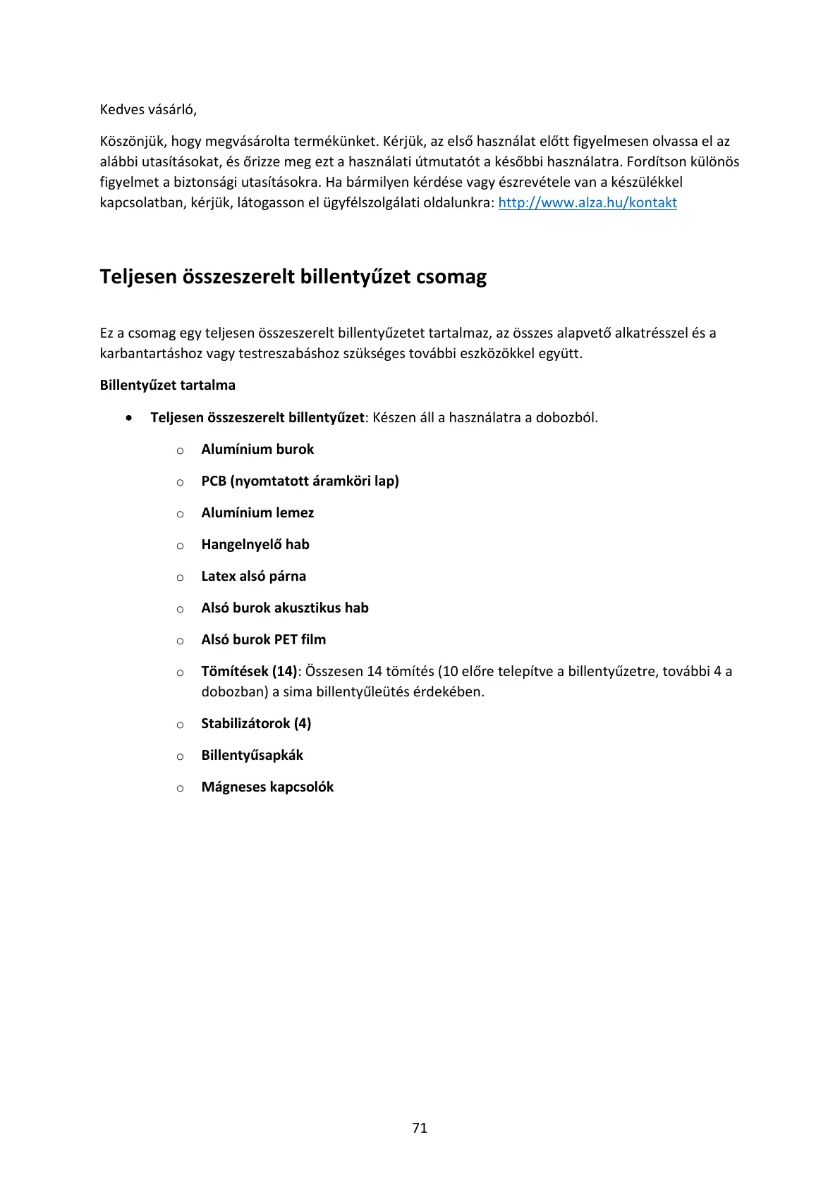 Ez a csomag egy teljesen összeszerelt billentyűzetet tartalmaz, az összes alapvető alkatrésszel és a
