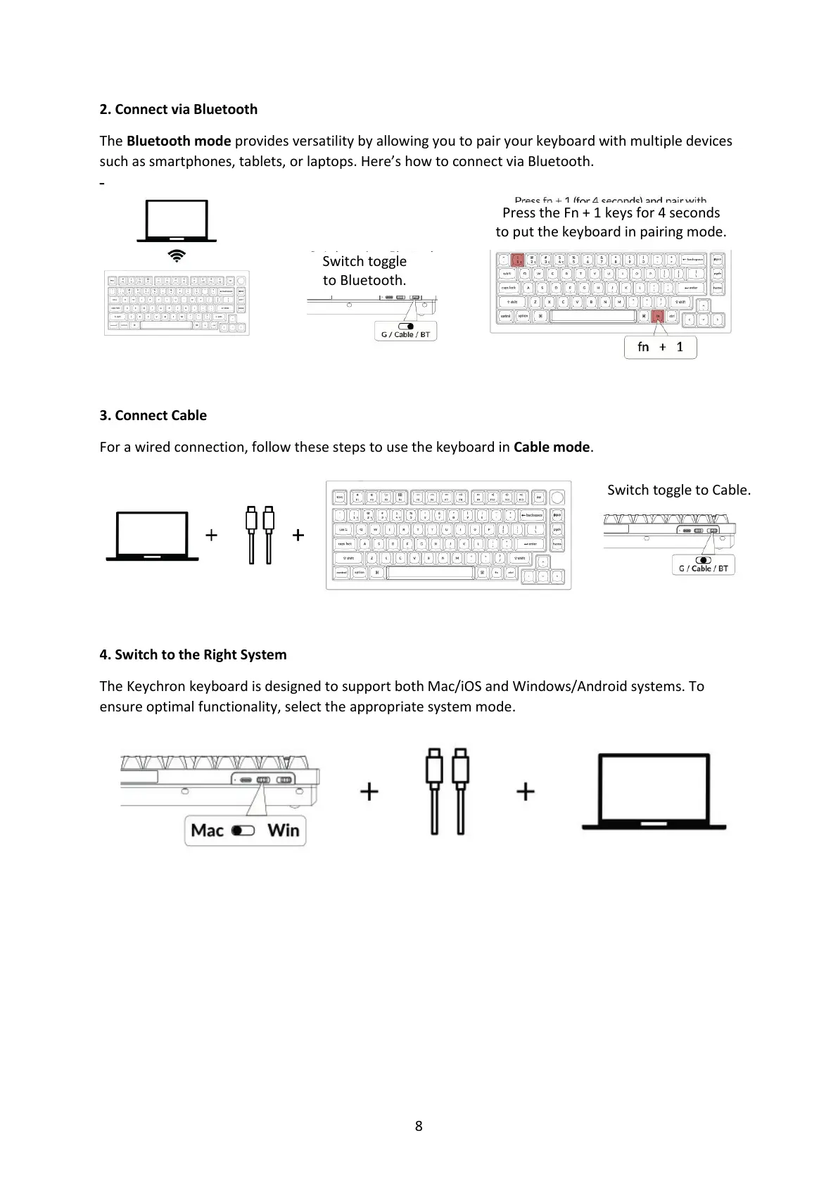 For a wired connection, follow these steps to use the keyboard in Cable mode.
