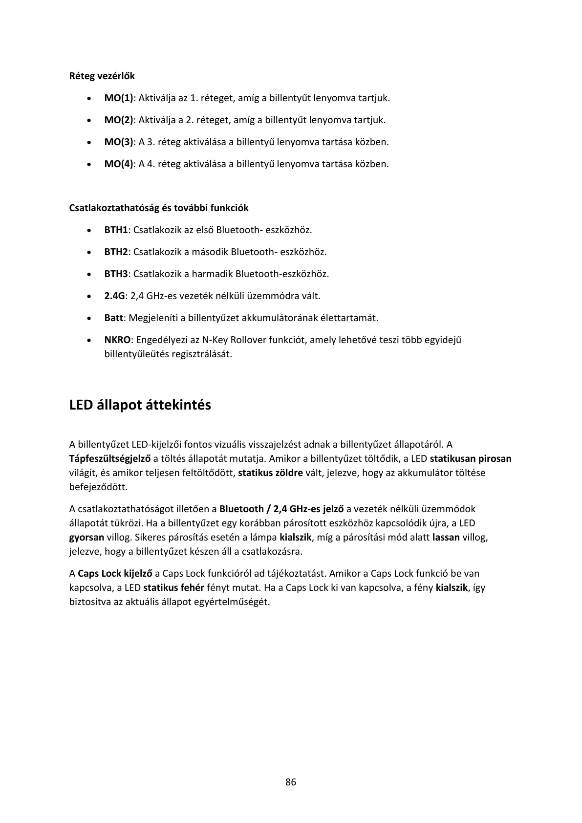 állapotát tükrözi. Ha a billentyűzet egy korábban párosított eszközhöz kapcsolódik újra, a LED