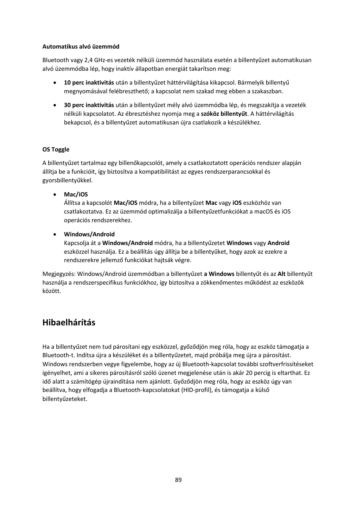 • 30 perc inaktivitás után a billentyűzet mély alvó üzemmódba lép, és megszakítja a vezeték