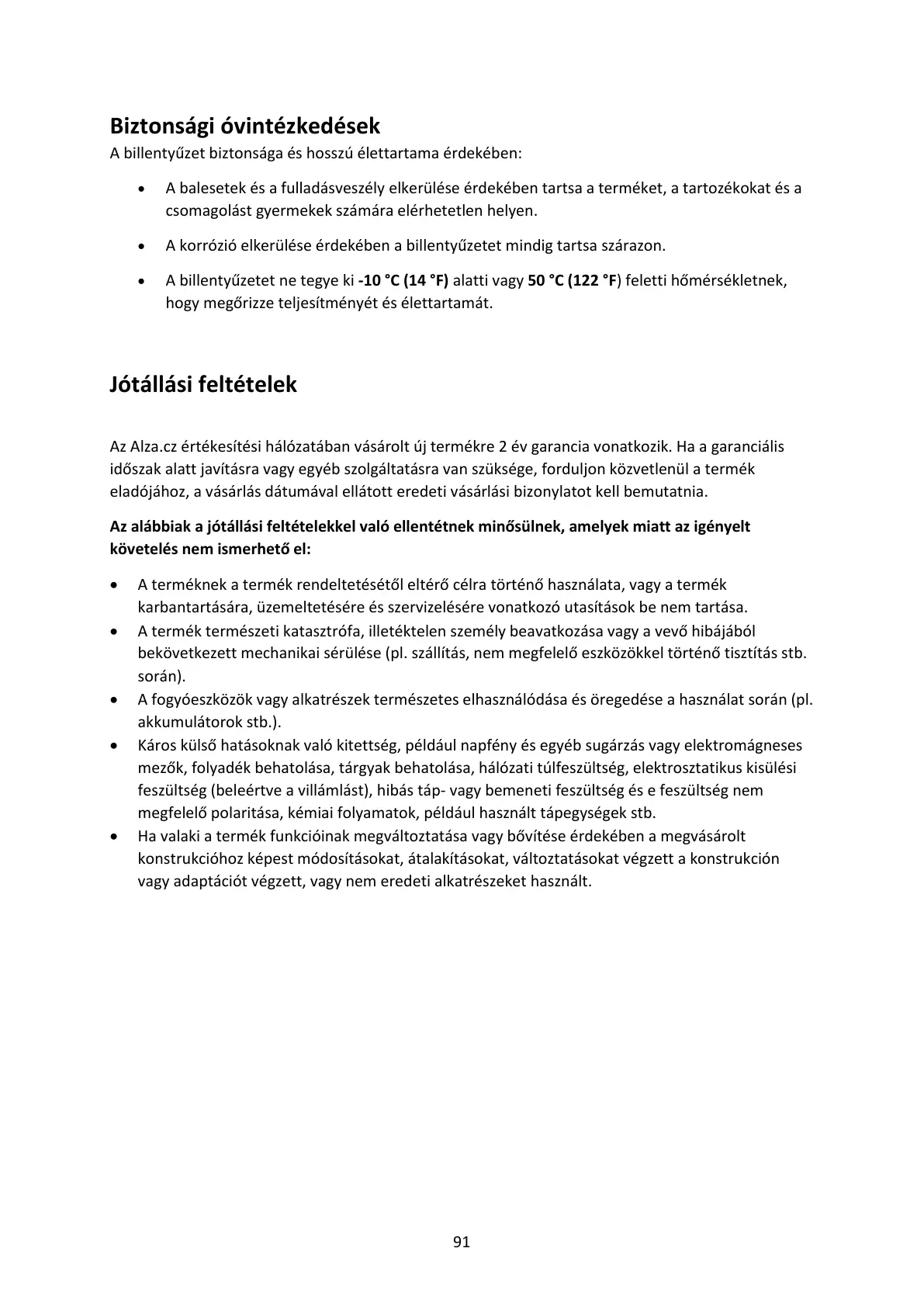 • A billentyűzetet ne tegye ki -10 °C (14 °F) alatti vagy 50 °C (122 °F) feletti hőmérsékletnek,
