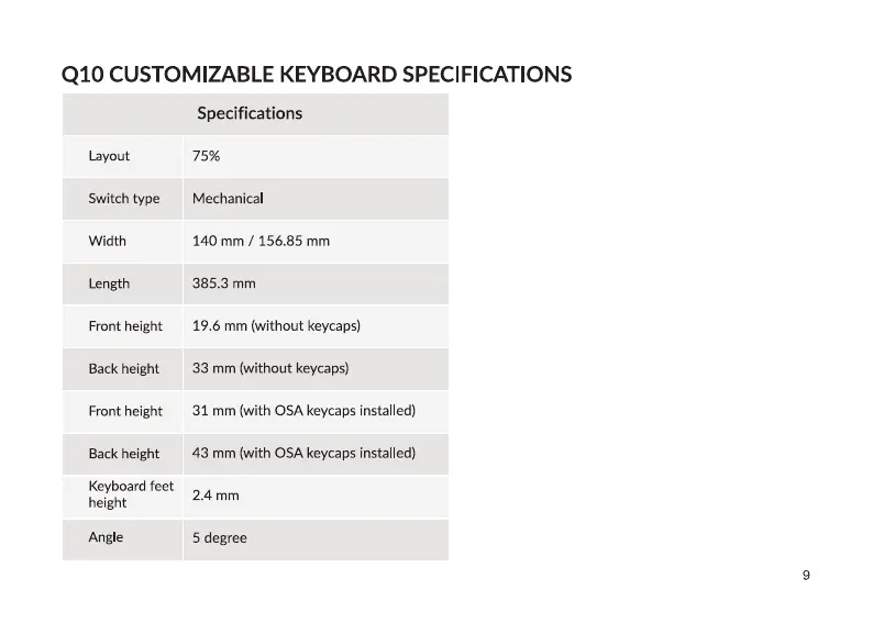 Q10 CUSTOMIZABLE KEYBOARD SPECIFICATIONS