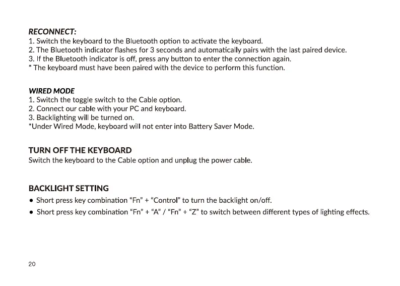 • Short press key combination "Fn" + "A" / "Fn" + "Z" to switch between different types of lighting effects.