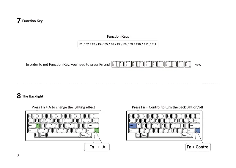 Press Fn + A to change the ighting effect Press Fn + Control to turn the backlight on/off