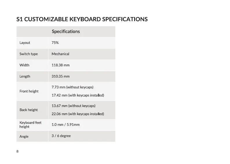 Keychron S1 - S1 Keyboard Specifications; Key Specifications