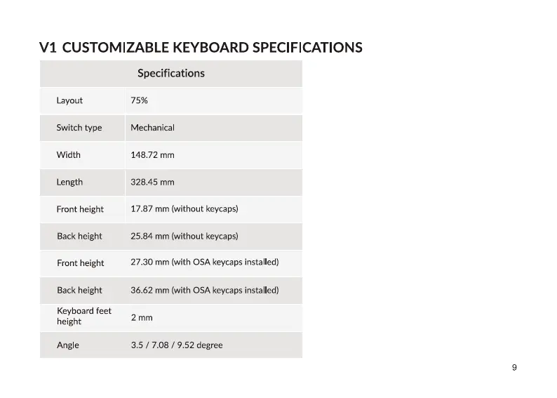VI CUSTOMIZABLE KEYBOARD SPECIFICATIONS
