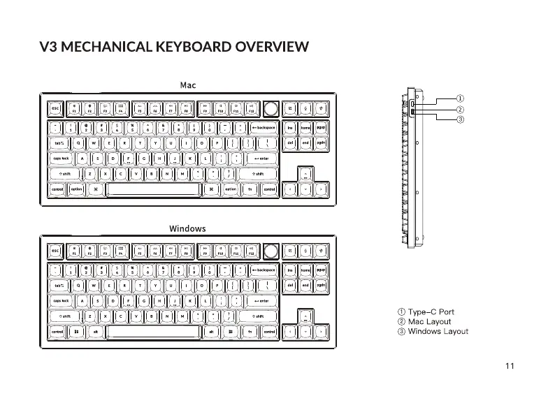 Keychron V3 - V3 Keyboard Hardware Overview; Mac and Windows Layout Identification; Keychron V3 Port Details