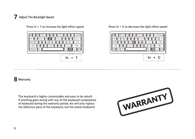 Press fn + T to increase the light effect speed Press fn + G to decrease the ight effect speed