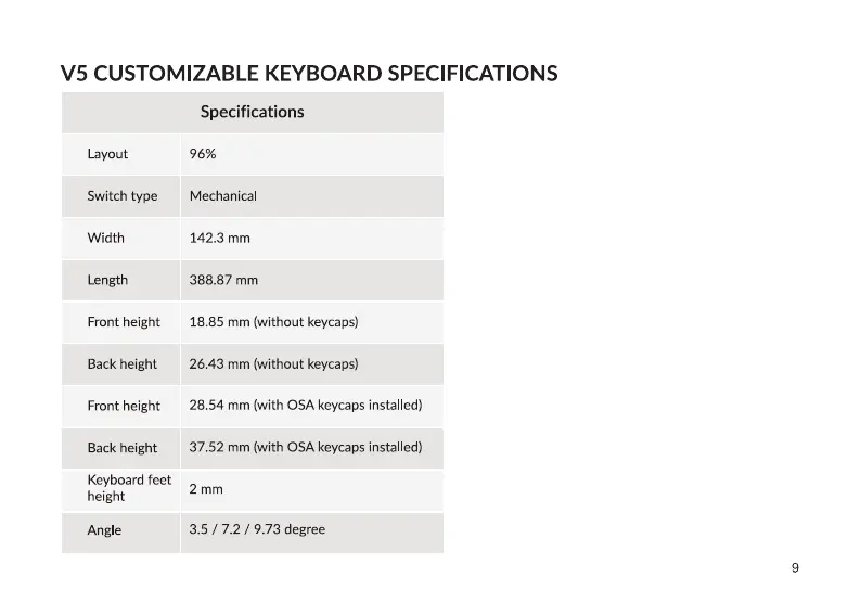 V5 CUSTOMIZABLE KEYBOARD SPECIFICATIONS
