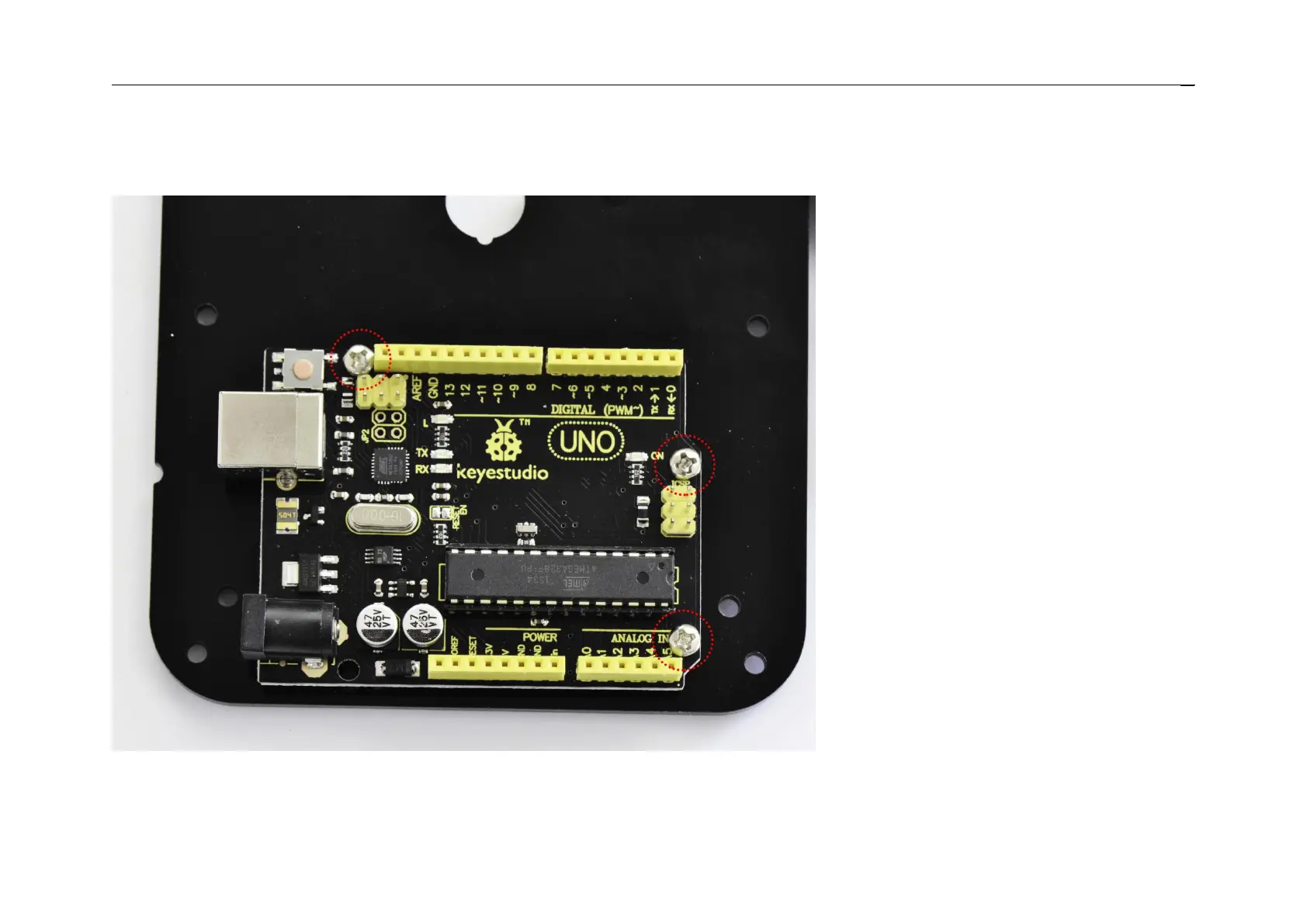 Firstly, screw the UNO R3 board on the pillar using three M3*6MM round-head screws.