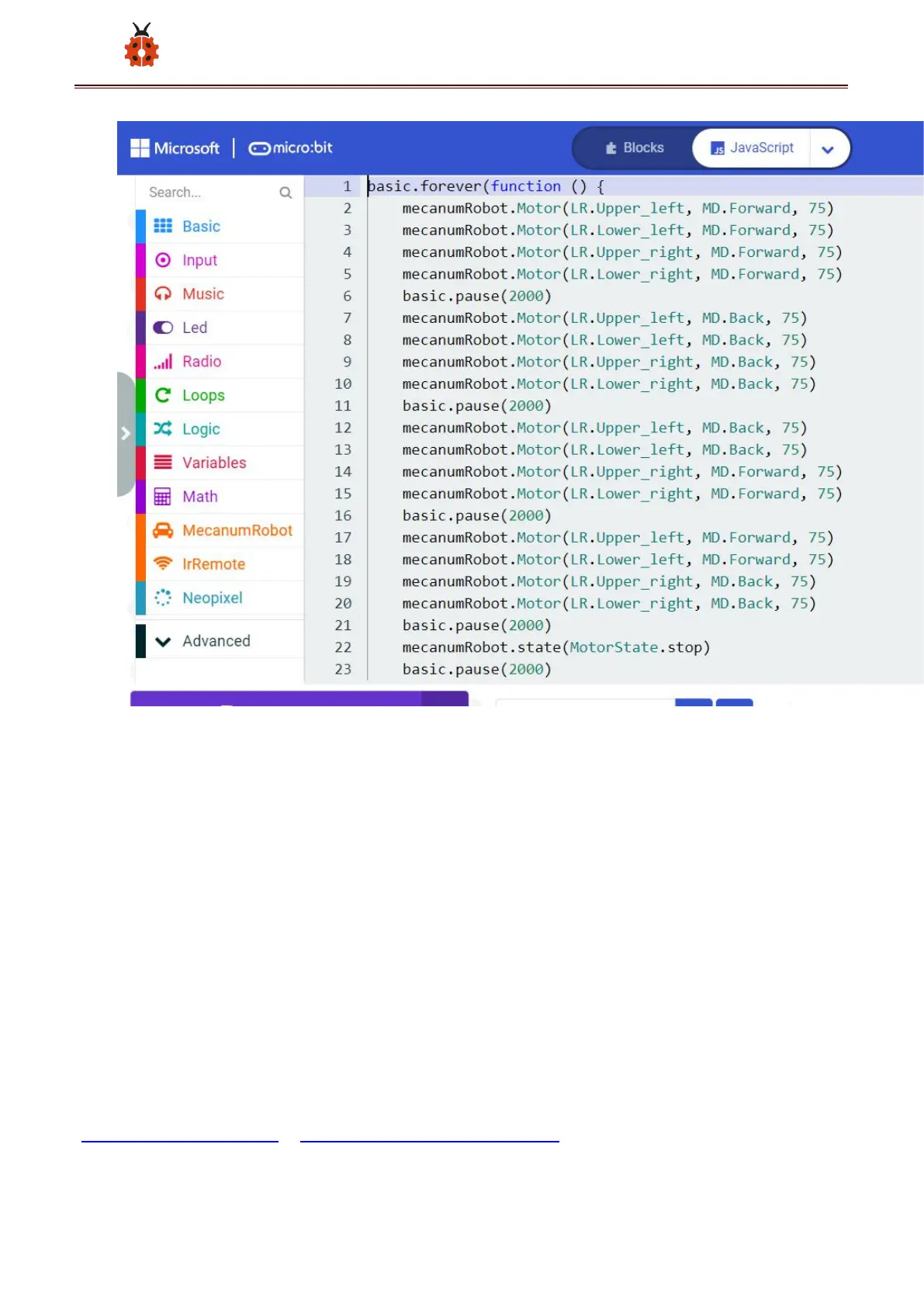 Download code 2 to micro:bit board, the car goes forward for 2s, turns