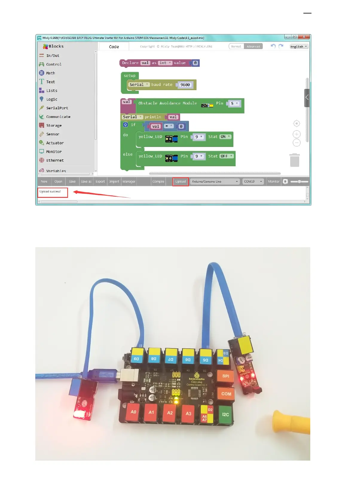 Done uploading the code, when the sensor detects an obstacle, the led is