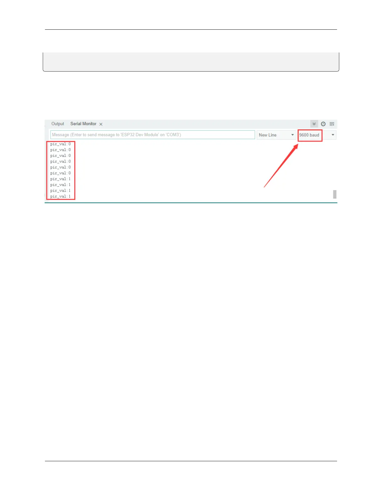 After connecting the wiring and uploading the code, open serial monitor to set baud rate to 9600, and the serial port
