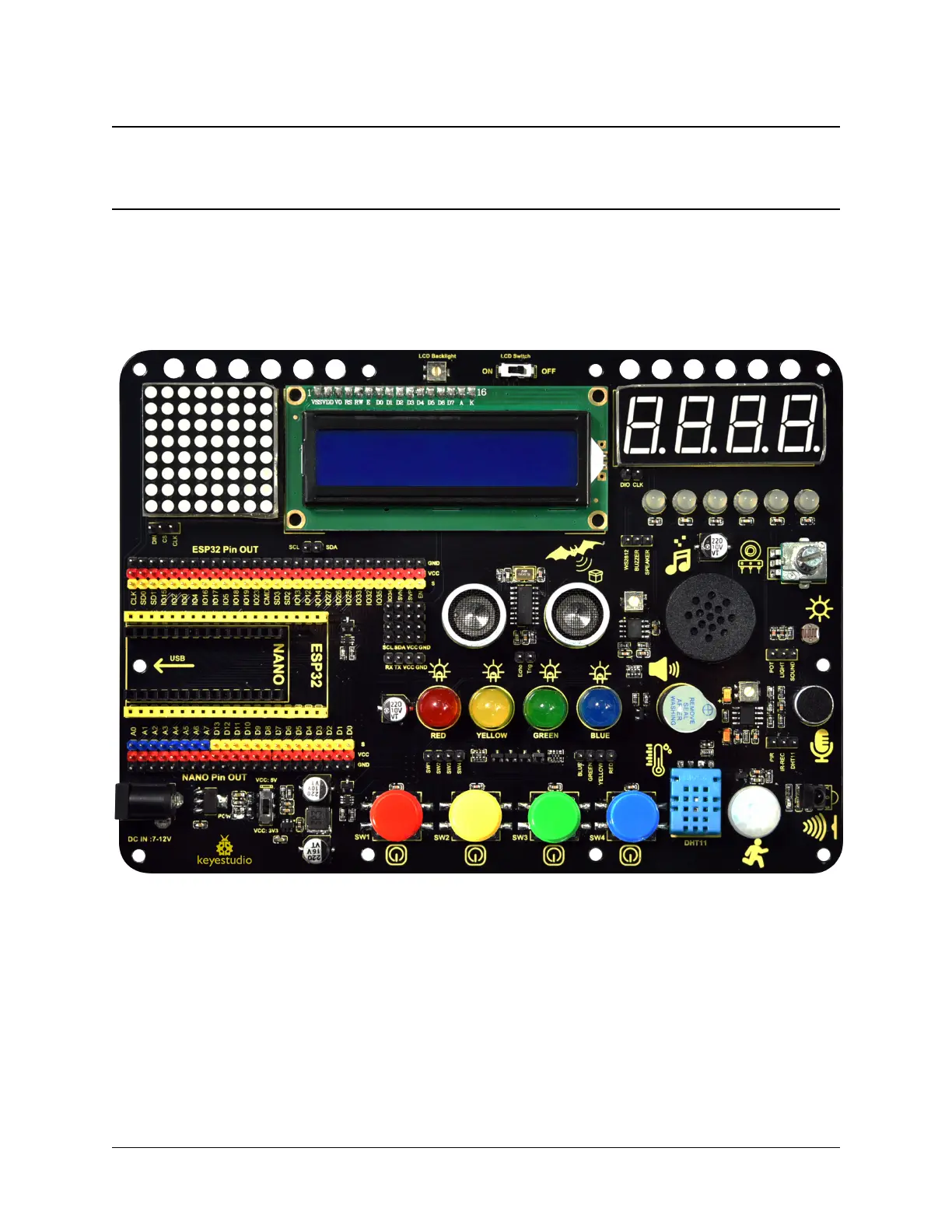 It integrates four buttons, four LEDs(red, yellow, green and blue), six WS2812 RGB LEDs, a buzzer, a PIR motion