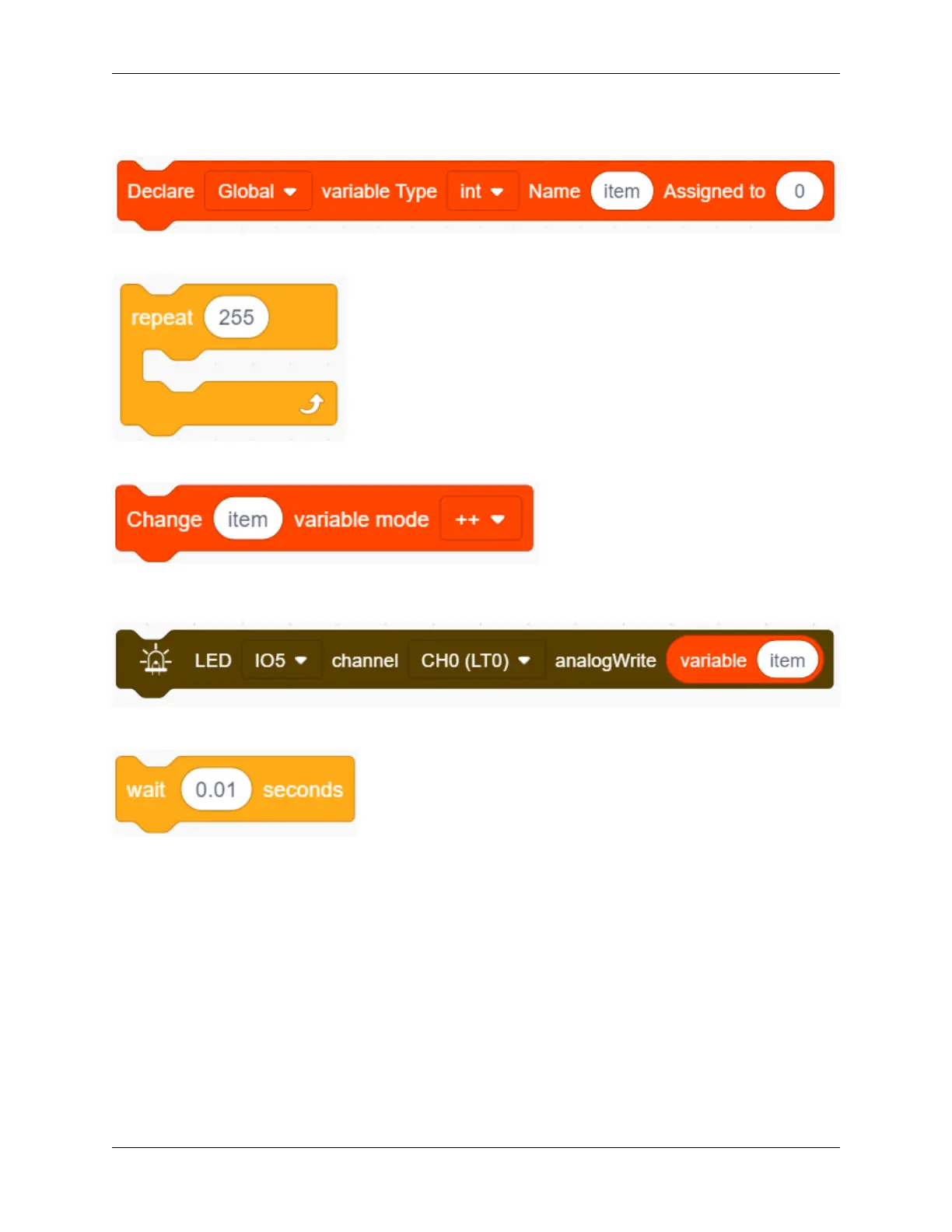 5. Drag the following block from “LED” part and set the LED pin to IO5. Then add an “variable” block in it and