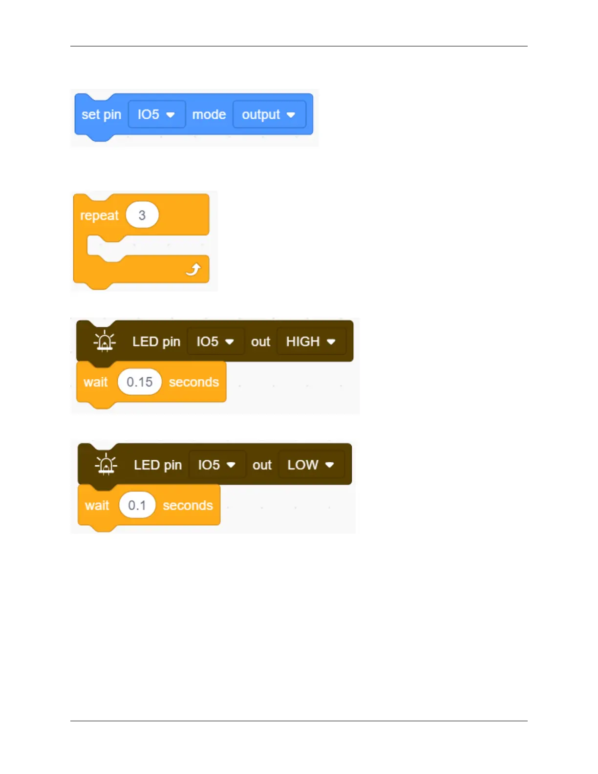 4. Drag the following blocks from “LED” part and set the IO5 pin to HIGH. Then set the delay time to 0.15s.