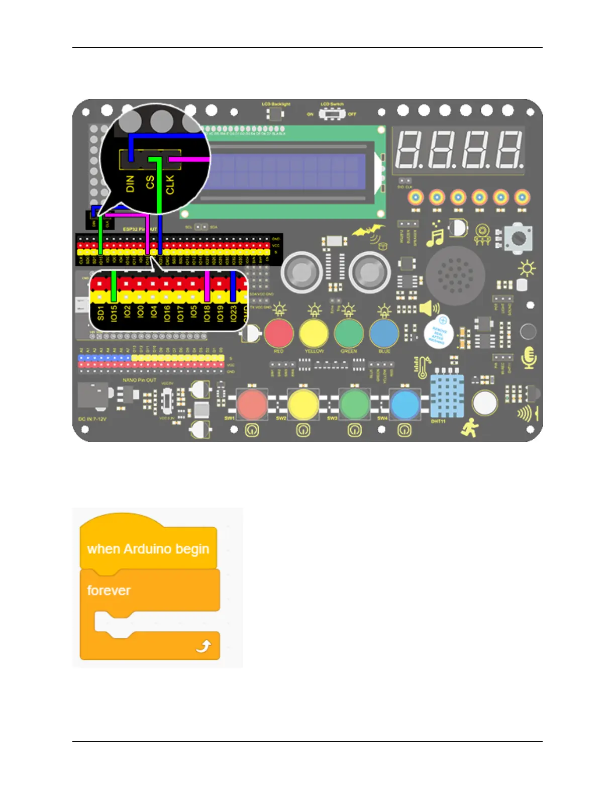 2.Drag a “init matrix display” from “Matrix” and set CS to IO15. DIN and CLK are fixed pin respectively to IO23 and