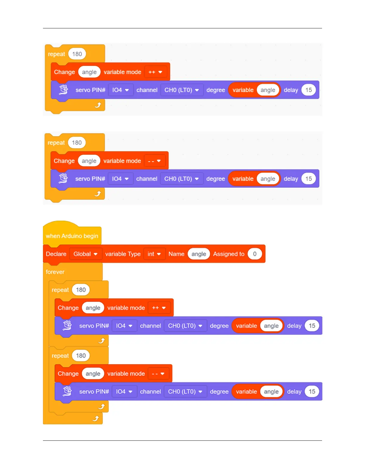 3. Servo gradually rotates from 180° to 0°: Repeat step 2, but set the variable mode to “- -”.