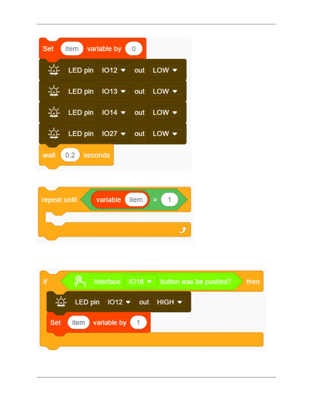 block under “then” and set the output to HIGH at pin IO12. And add a “set item variable by 1” to exit this