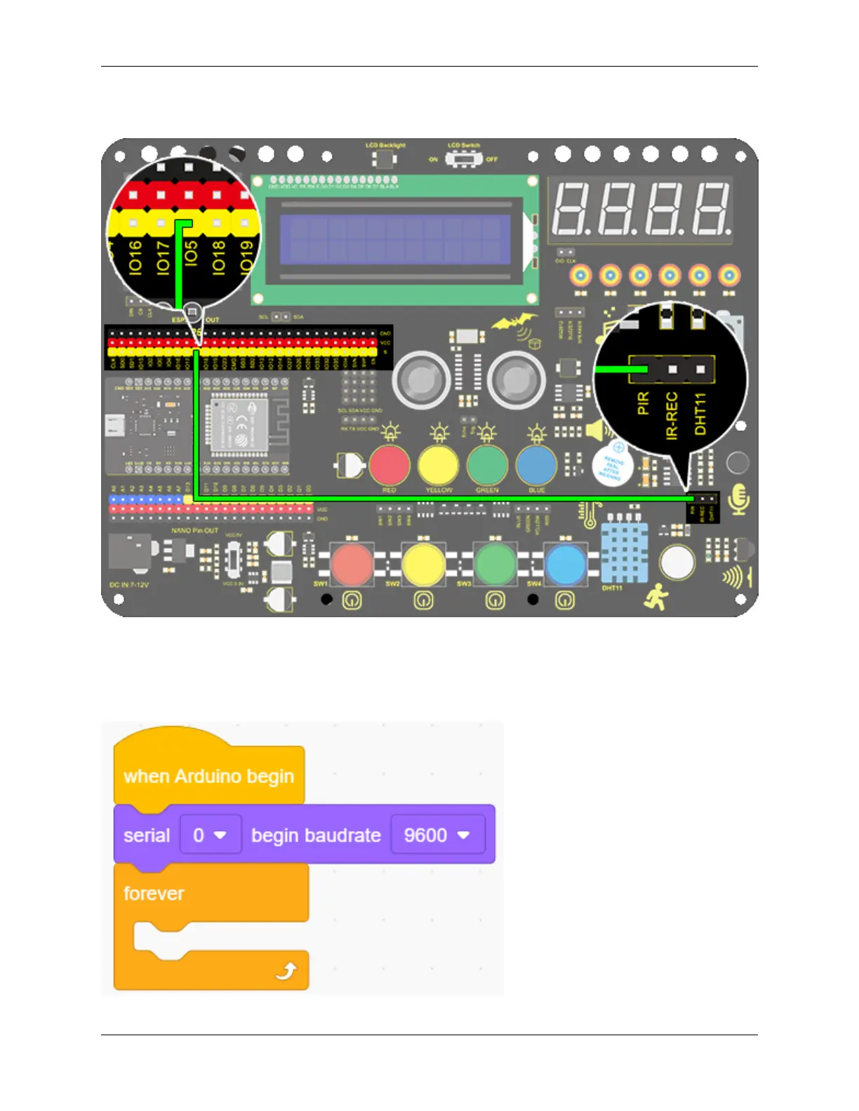 1. Add the two basic blocks and drag a “baud rate” block from “Serial” between them. Set the serial baud rate to