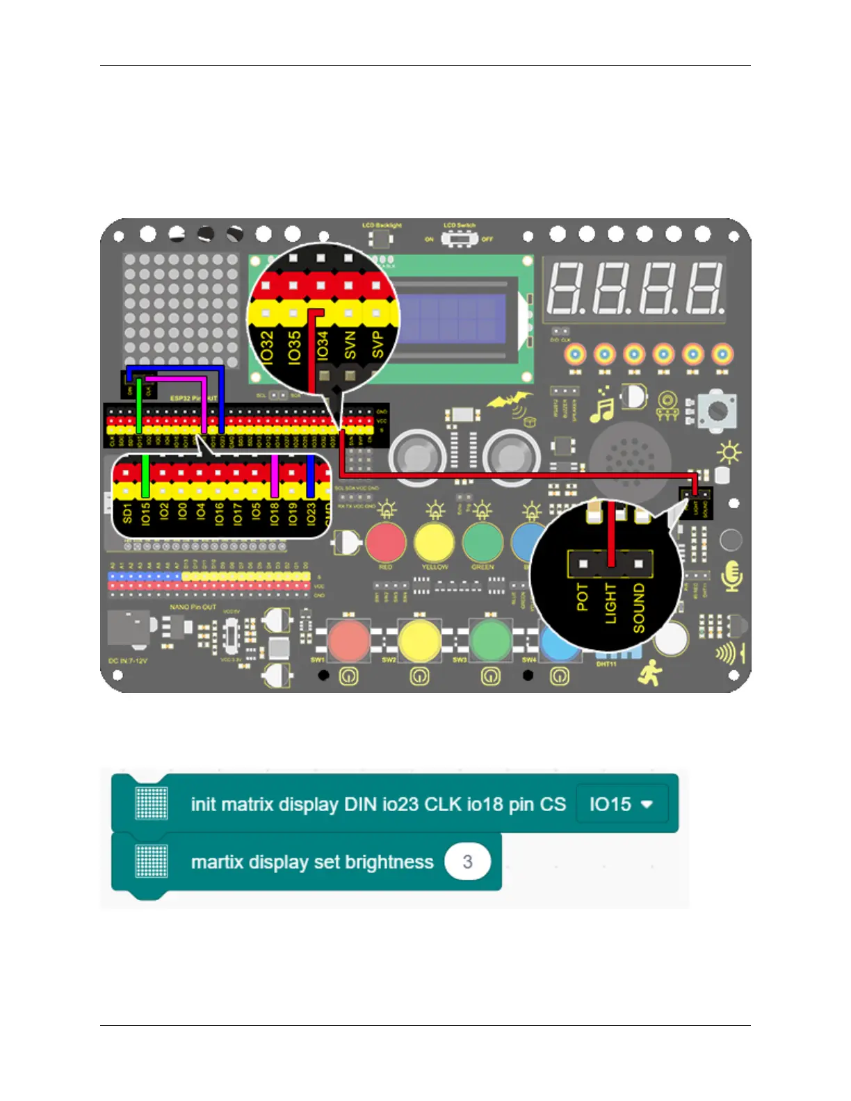 2. In “Matrix”, initialize the dot matrix display and set pin CS to IO15. Add a “brightness setting” block and assign