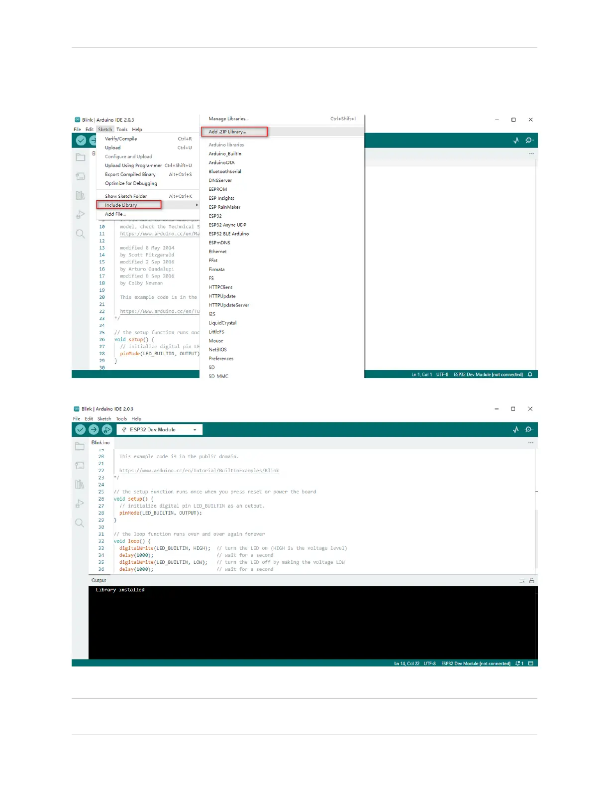 Select the zipped files you need and click ok to add a library. If success, the message bar will show “Library installed”.