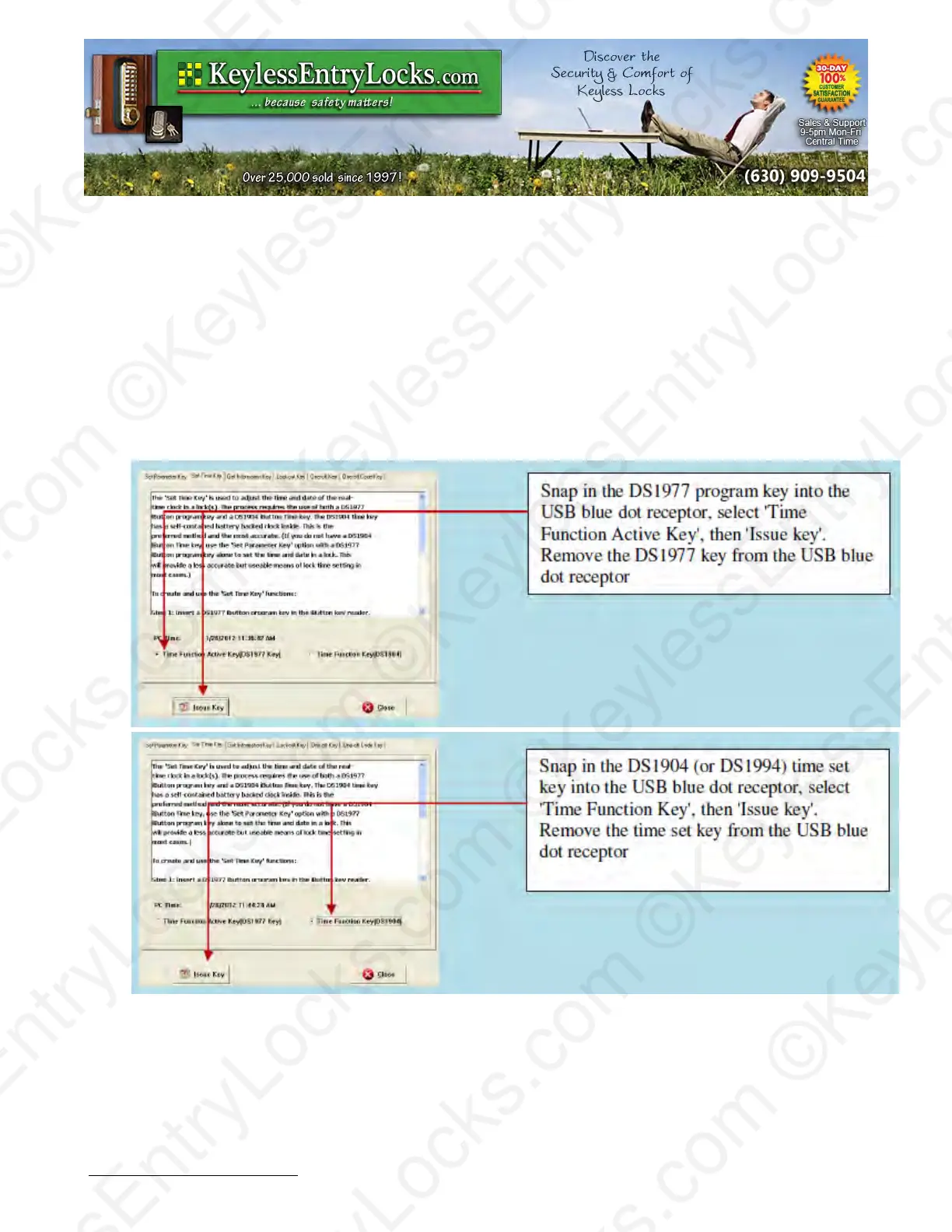Apply first the DS1977 program key to each lock, then apply the DS1904 (or 1994 time)
