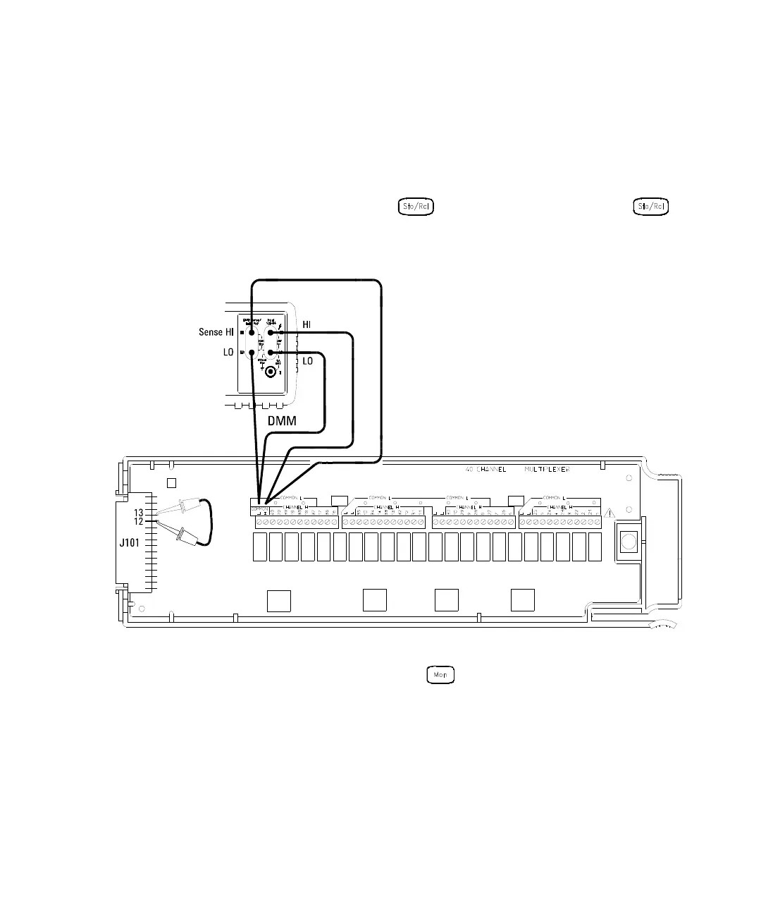 Make the connections to the 34908A as shown in the diagram below. Be sure to