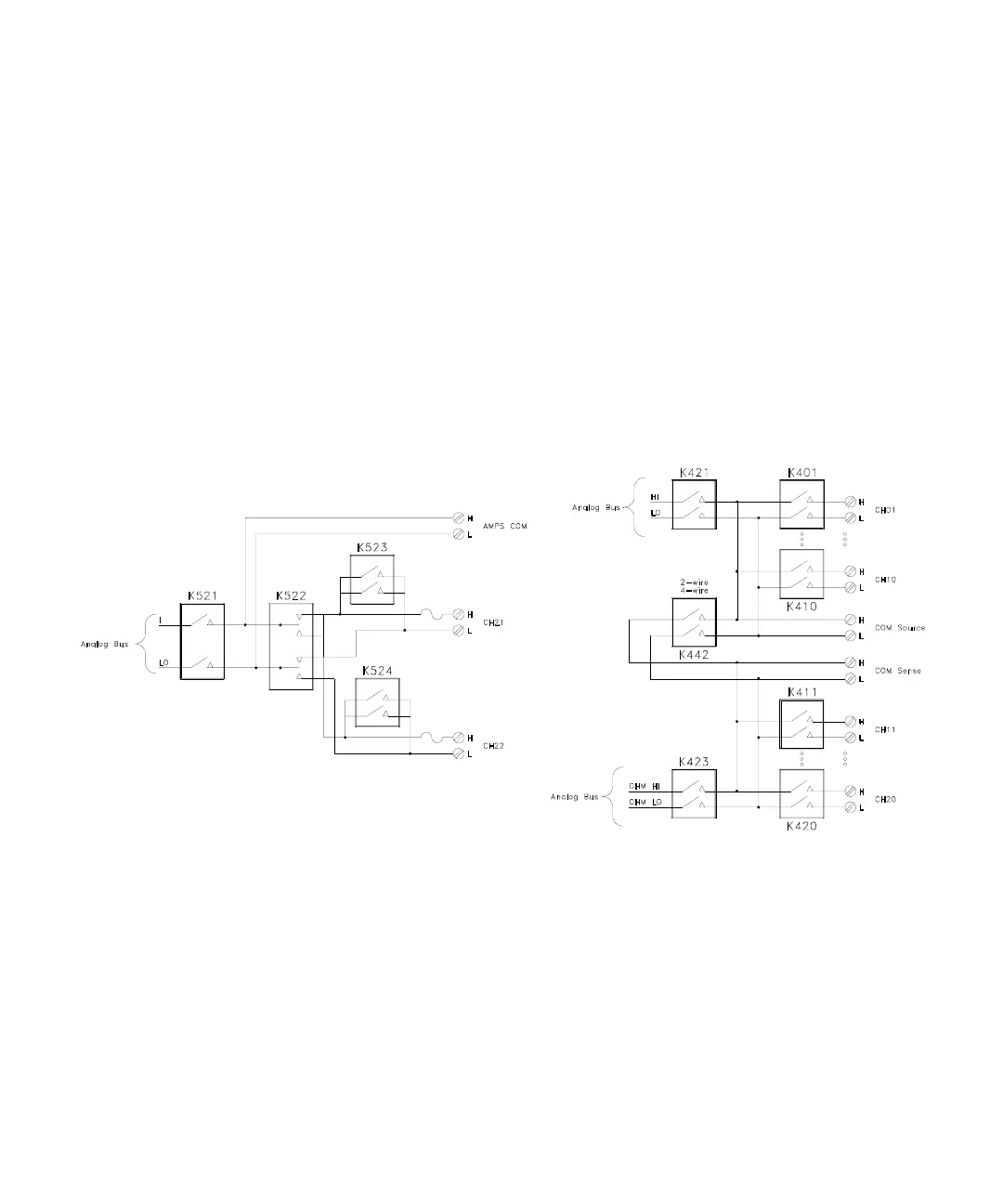 K422 for voltage and 2-wire Ohms switching. When K422 is open, the banks are