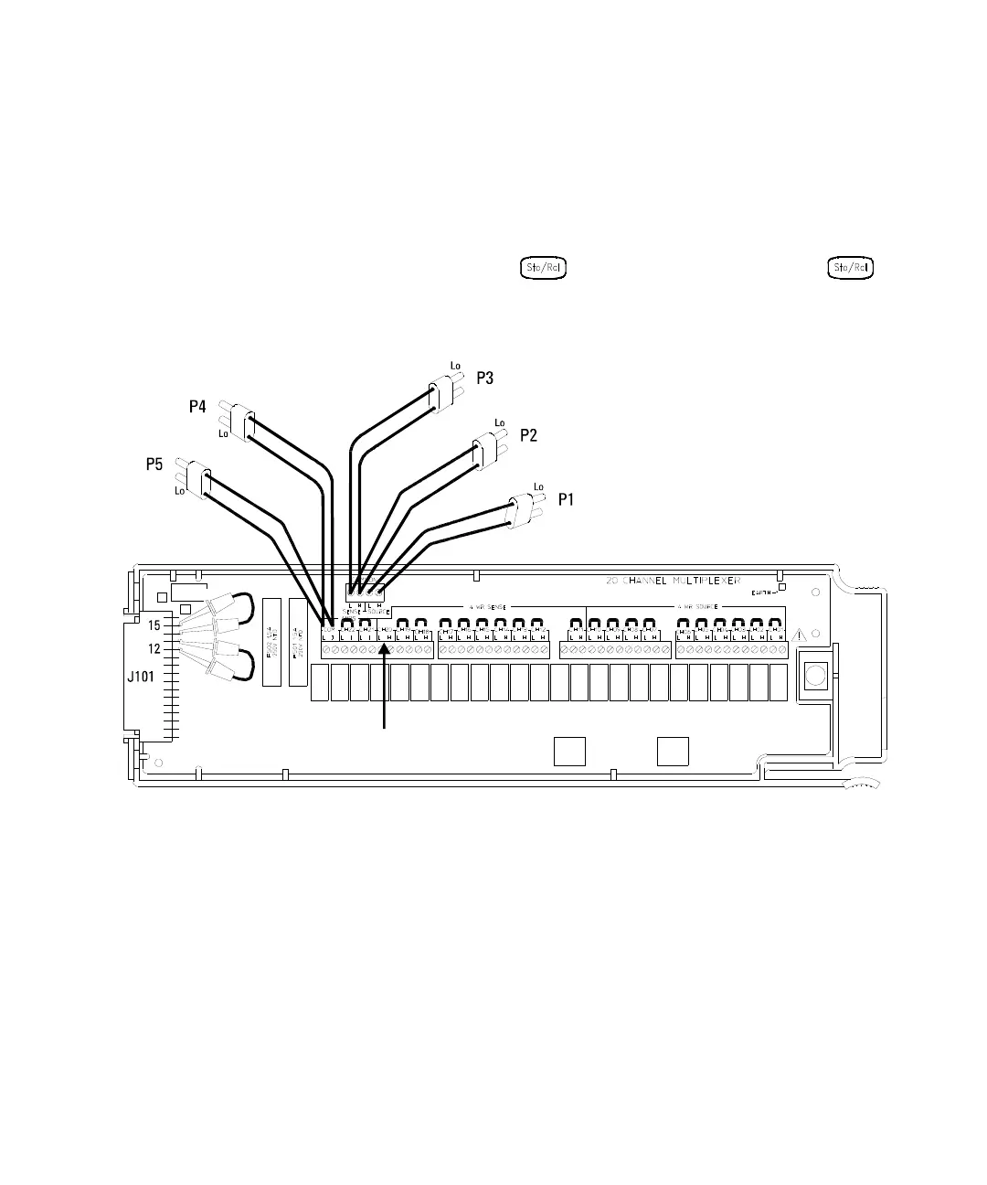 Make the connections to the 34901A as shown in the diagram below. Be sure to