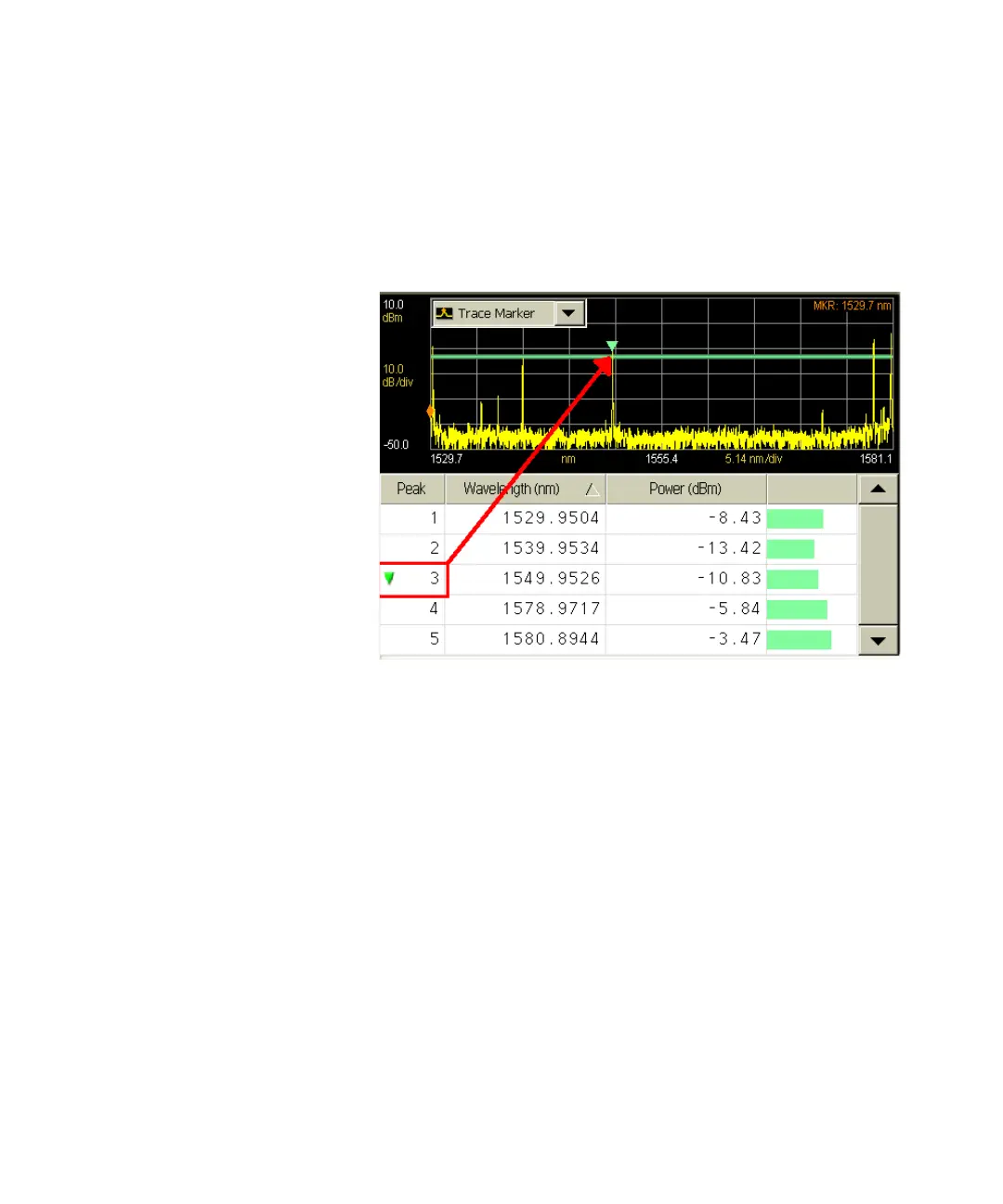 • Click any cell in the “Peak” column of the table. The peak marker will