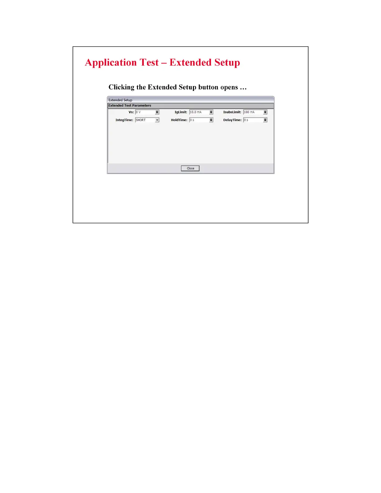 The Extended Setup dialog box allows the user to set the additional test setup parameters. In the Id-