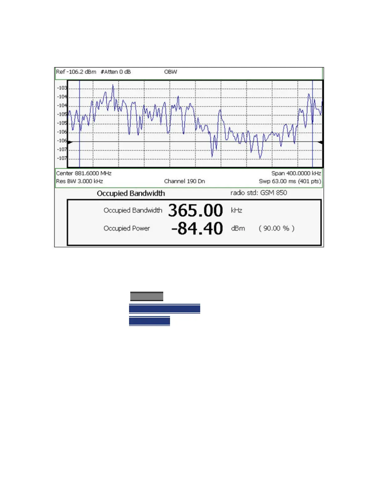 The graphic above shows an OBW measurement; Chan 190 Downlink; GSM850