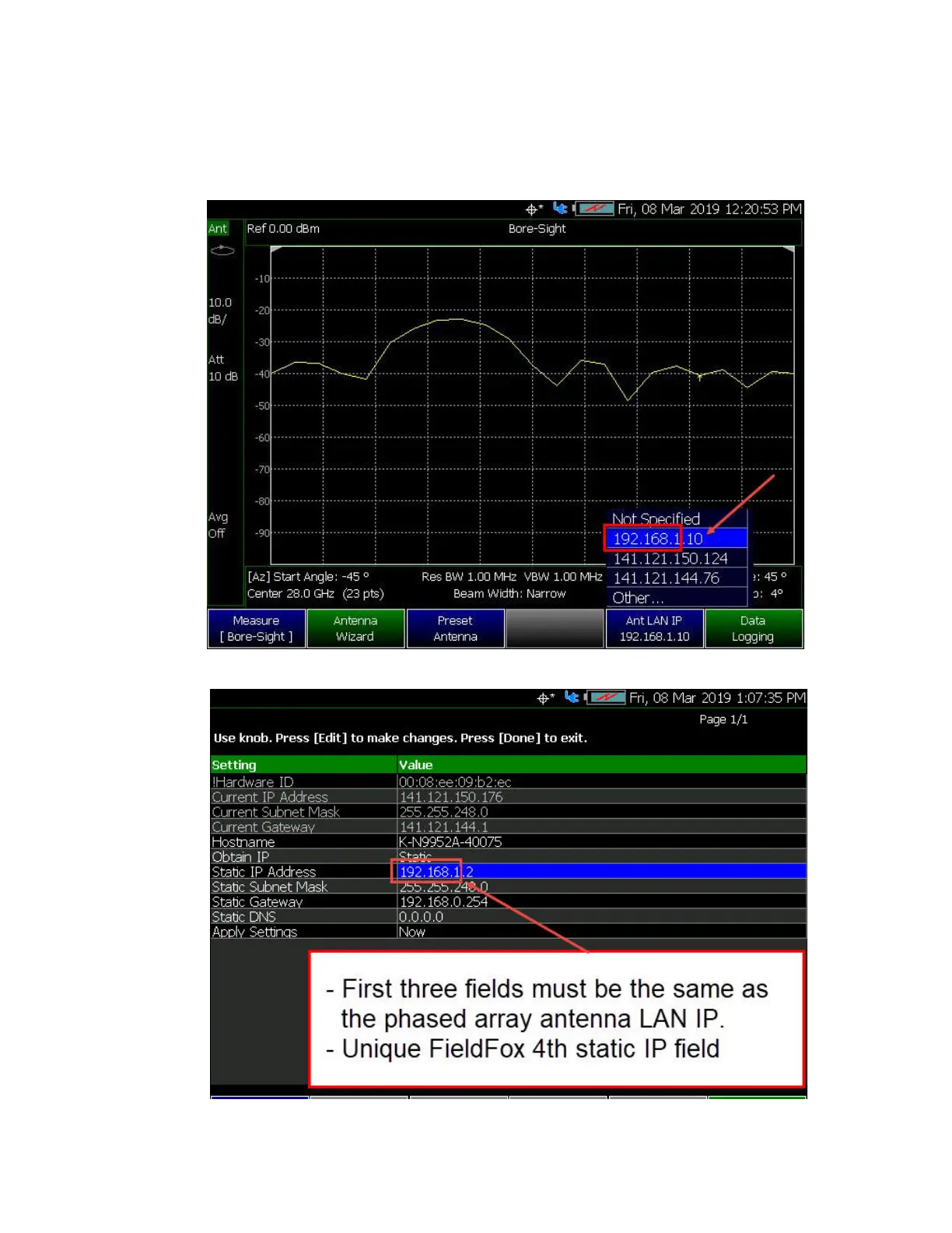 Setting the FieldFox static IP address - First three fields the same as the antenna