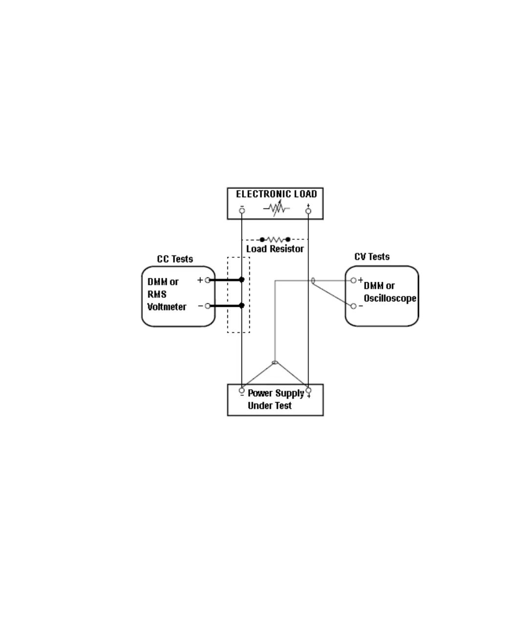 This setup is used for most tests and it requires the DMM, electronic load, and