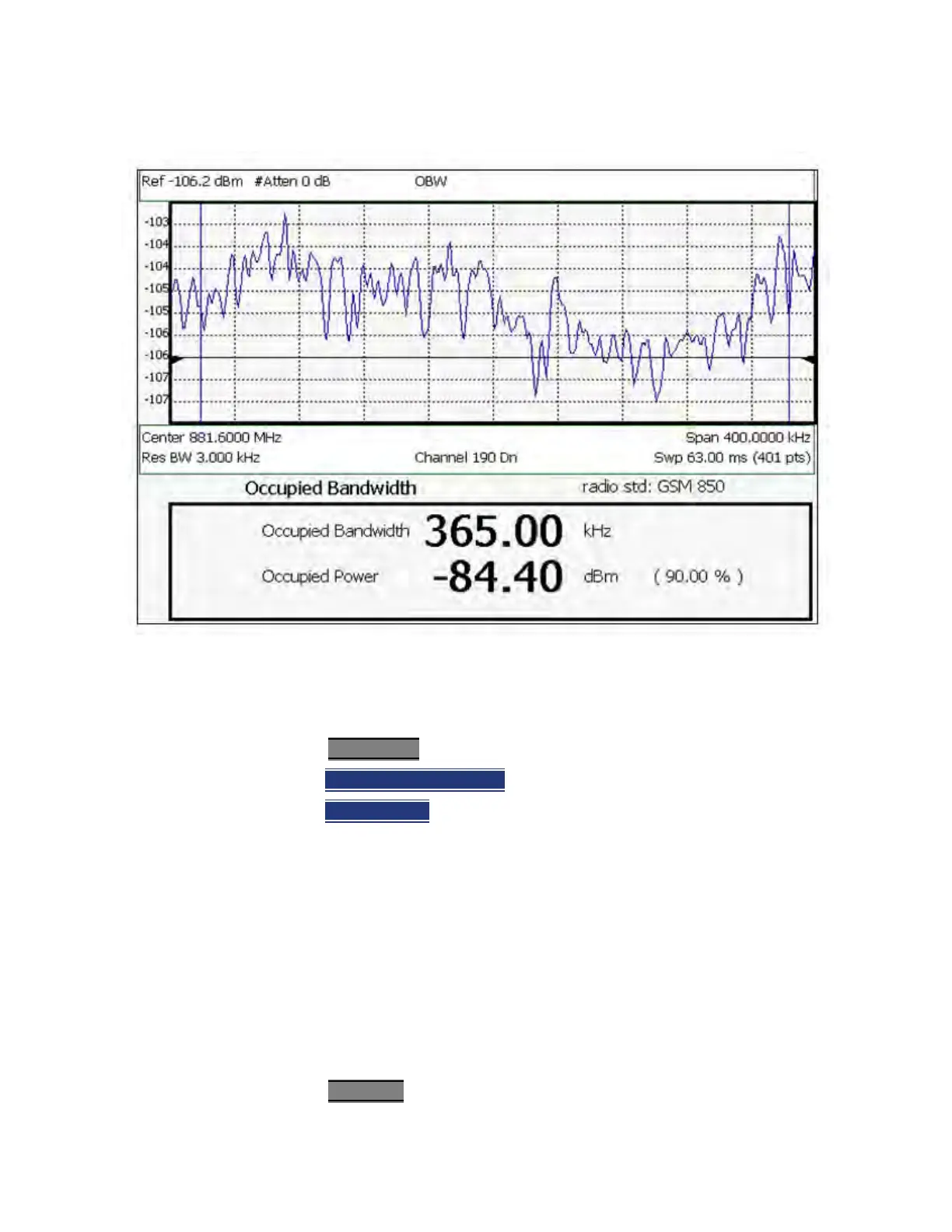 The graphic above shows an OBW measurement; Chan 190 Downlink; GSM850