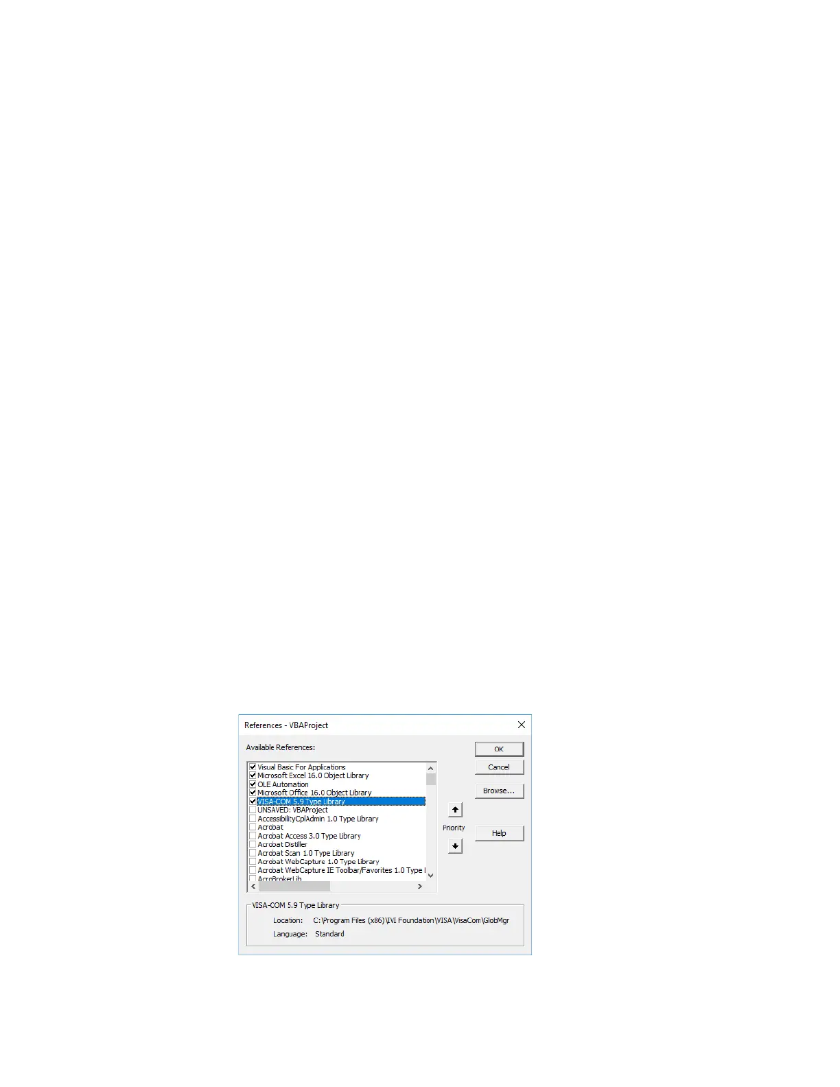 2 In the References dialog, check the "VISA COM 5.9 Type Library".