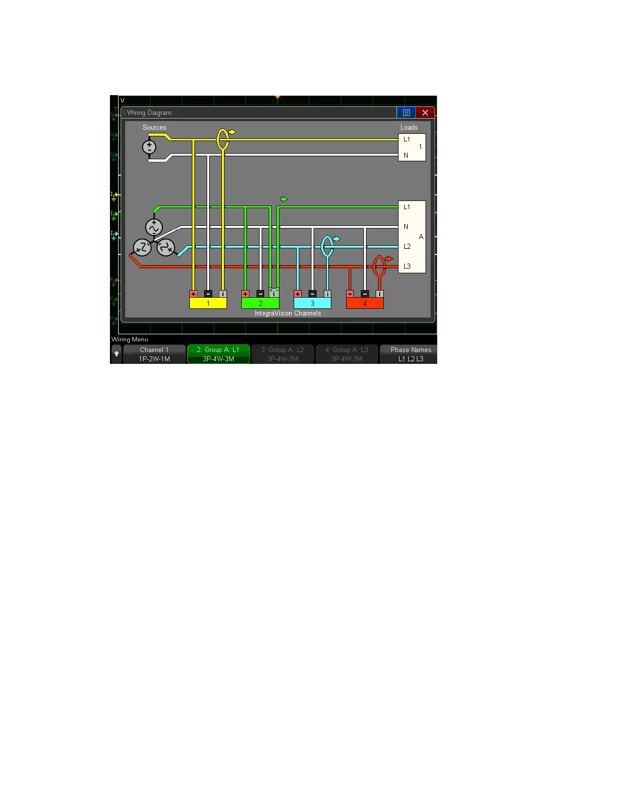 Here, the second softkey is 3P-4W-3M. Channels 2 through 4 are L1, L2, and L3, respectively.