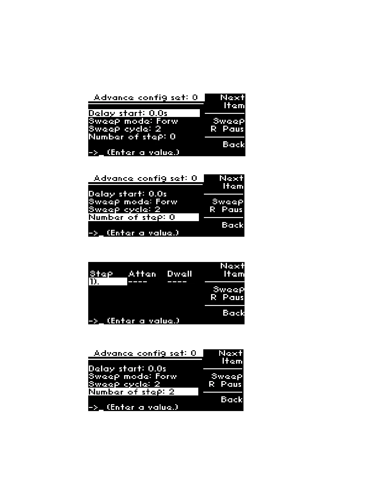 To configure delay start; start/stop attenuation and step size; dwell’s time and sweeping option: