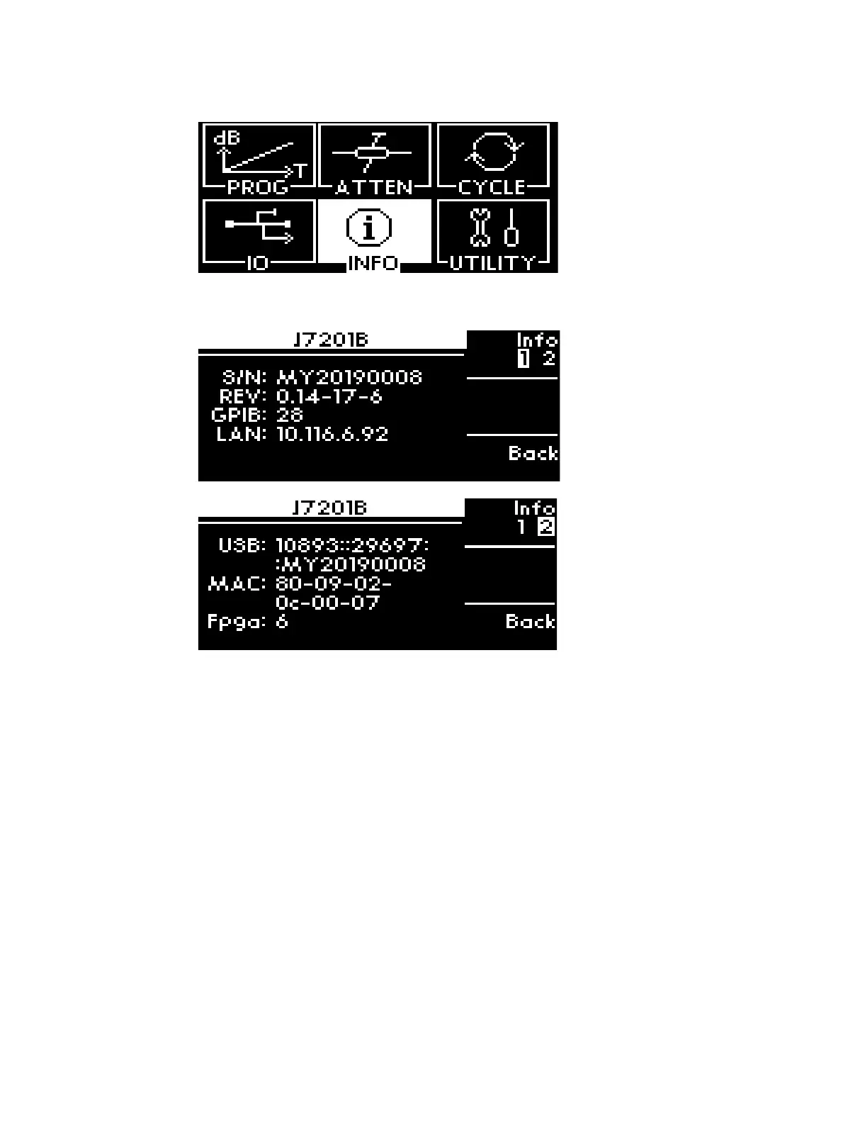 2 There are 2 pages of information for J7201A/B/C. Press Info softkey once to move to page 2 or