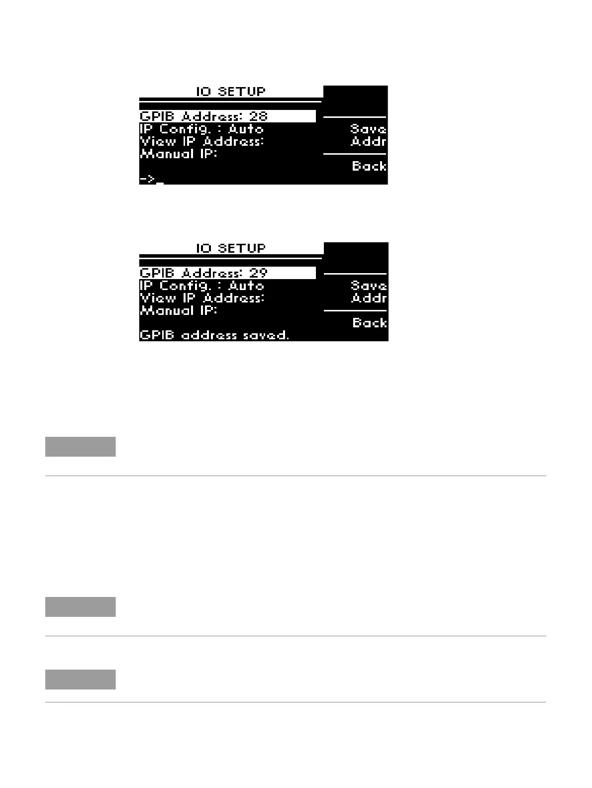 4 Once saved, sentence of “GPIB address saved” appears on the bottom of the screen.