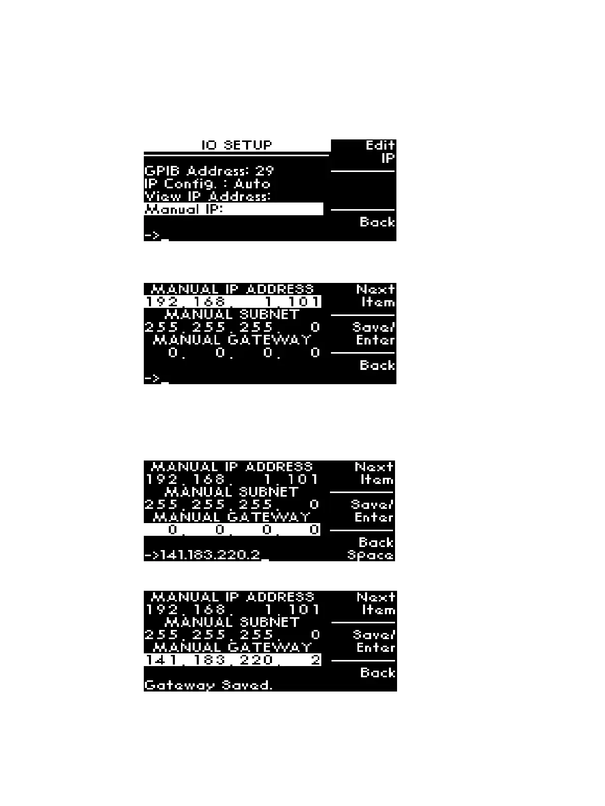 5 Press Back Space if you make an error while typing the address, subnet or gateway.