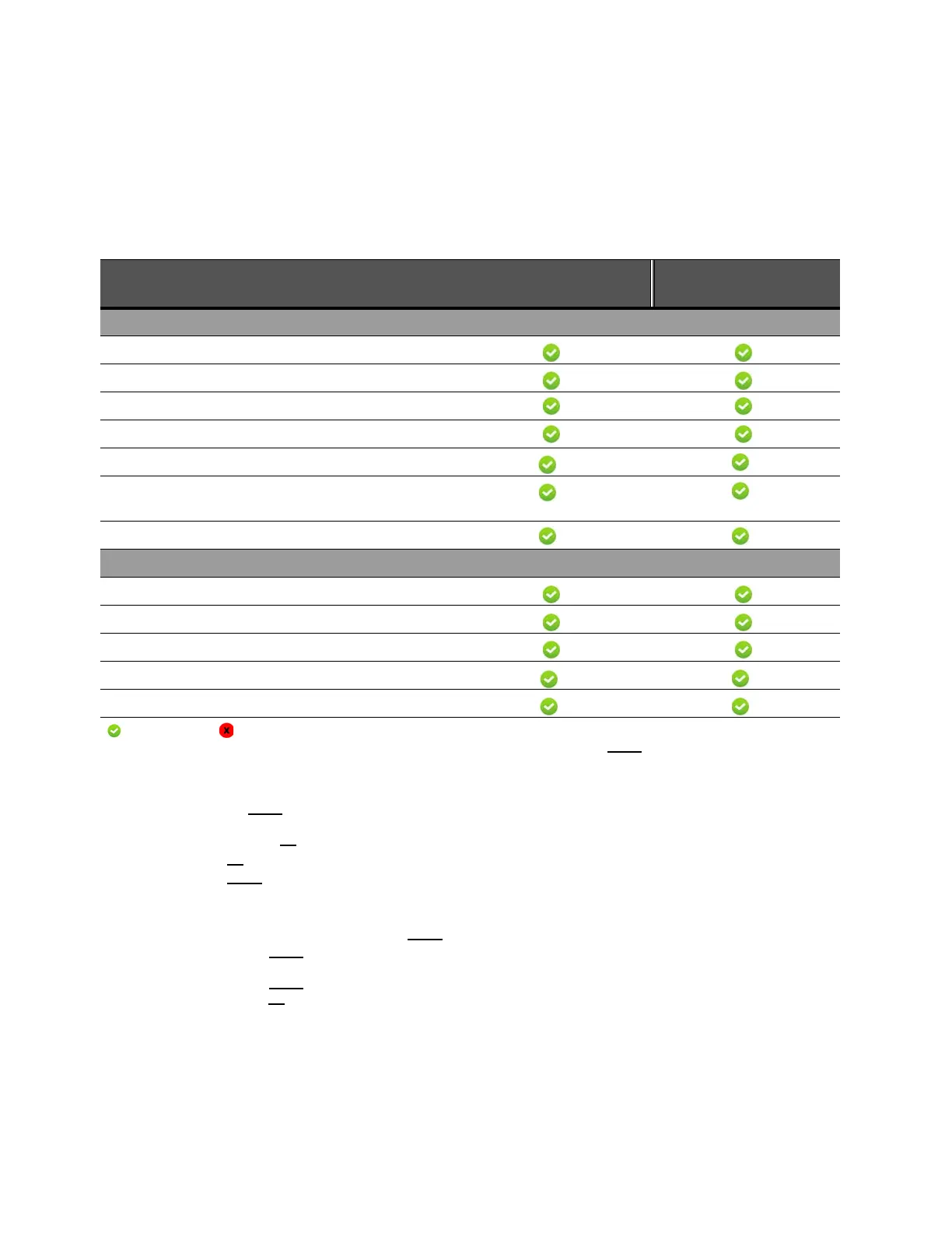 = Supported action; = Not supported or Not applicable.
