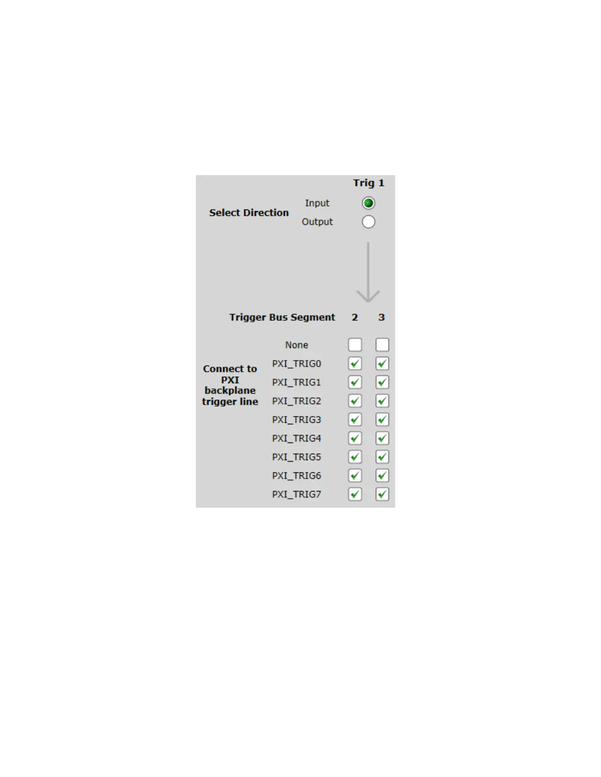 When Trig 1 is configured as Input, you can select the set of PXI_TRIG[0:7] lines
